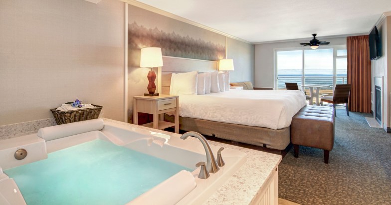 Nestled in one of the most beautiful and tranquil stretches along the central coast in Yachats, with the ocean on one side and forested mountains on the other, Overleaf Lodge & Spa is one of the best Oregon Coast hotels to melt stress away with the one you love. It boasts a luxurious spa with a menu of signature facials and body treatments, massages, and Reiki therapy. The ocean-view soaking tubs and steam and sauna rooms are available for complimentary use to guests. Breakfast is made from scratch with a focus on healthy and delicious, and picnic baskets with Pacific Northwest items, locally made wine, or beer can be put together for your outings. There is a wide range of room options, with special perks like fireplaces, whirlpool tubs, and ocean views.